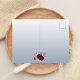 A l'avant : Un arrière - plan à dégradé bleu poussiéreux et blanc avec un cadre géométrique en faux or. Décorée de fleurs bordeaux foncé et roses, de plumes roses et boho. Modèles pour le nom de la mariée et les détails du parti. Le nom est écrit avec un script de style écrit à la main, des lettres de couleur noire. Conseil : Si vous ne voulez pas qu'il ressemble à une carte postale, cliquez sur customiser, allez à l'arrière et retirez le séparateur et le timbre postal.