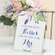 Elégante douche nuptiale devinez avec élégance le panneau de piédestal des baisers avec un grand bouquet de fleurs rose vif, prune, navy et lilas violet et fleurit avec des feuilles verts sauge avec un script chic.