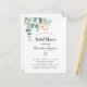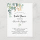 Un arrière - plan blanc chic. Décoré de feuilles d'eucalyptus verts, de sprigs, de verdure et d'une fausse feuille d'or. Personnalisez et le nom de la mariée à être et les détails du parti. Lettres noires. Retour : Carte postale. Conseil : Si vous ne voulez pas qu'il ressemble à une carte postale, cliquez sur customiser, allez à l'arrière et retirez le séparateur et le timbre postal.