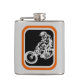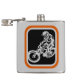 Ein bergab Mountainbike und Reiter. Das Fahrrad wird in Grau gezeichnet, wobei auf schwarzem Hintergrund die Technik des "weißen Raumes" verwendet wird. Der Fahrer geht hinunter und wird durch das Vorderrad des Fahrrads gesehen, das größer (naher) als das Hinterrad aussieht.