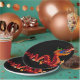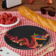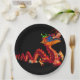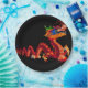 Glühender chinesischer Parade-Drache. Dieser Drache leuchtet orange und rot mit blau und grün oben. Der Hintergrund ist schwarz und sieht fast so aus, als würde er schweben.