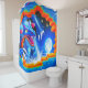 Dieser Duschvorhang hat ein Drachendesign darauf.