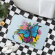 Schwarz-Blau-Drache mit blauen Schmetterlingsflügeln, eingebettet in einen Strauß farbenfroher Blume in einem hellblauen Hintergrund