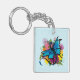 Dragon bleu et noir aux ailes papillon niché au milieu d'un bouquet de fleurs colorées sur fond de bleu clair