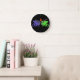 Wall clock featuring two dragons breathing fire. A charming edition to a bedroom or playroom. Contemporary purple and lime on black background.