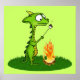 Niedlicher kleiner Cartoon-Drache mit großen googly Augen und einem gelben Horn, das ein Marshmallow über einem Lagerfeuer toastet. Originelle Cartoon-Kunst von Taylor Addams.