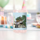 Ein niedlicher, grüner Drache, der mit seinem Teddybär, seiner Kerze, seinem Federstift und seiner Lesebrille in einem blauen Hintergrund schlummert