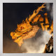 Drachenkopf mit roten Augen im dunklen Himmel mit Rauch oder Wolken, die auftauchen.