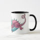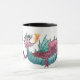 Eine weiße Tasse mit schwarzem Rand und Griff und ein lila und grüner Drache aus einer Aquarellmalerei von Judy Adamson. Passende Grußkarten sind ebenfalls verfügbar.