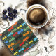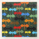 Eine Flügelgruppe aus Drachen in den Farben Schwarz, Braun, Rot, Orange, Gelb, Blau und Grün fliegen Flügel über eine tiefgrüne Kulisse, die sich nach oben erhebt. Die Drachen werden in einem Tätowierungsstil gezeichnet.