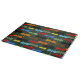 Eine Flügelgruppe aus Drachen in den Farben Schwarz, Braun, Rot, Orange, Gelb, Blau und Grün fliegen Flügel über eine tiefgrüne Kulisse, die sich nach oben erhebt. Die Drachen werden in einem Tätowierungsstil gezeichnet.