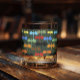 Ein Drachenflügel in den Farben Schwarz, Braun, Rot, Orange, Gelb, Blau und Grün fliegen Flügel über eine tiefgrüne Kulisse, die nach oben aufsteigt. Die Drachen werden in einem Tätowierungsstil gezeichnet.