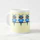 Farbige, lustige und niedliche blaue Vögel auf einem Draht tweetend mit einem Vogel auf dem Kopf. Humorsche Kaffeemugs für Vögel. Einzigartige und lustige Vogelbekleidung und Geschenke für Vogelbeobachter, Ornithologen und Vogelliebhaber.