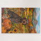 Feiern Sie die Schönheit des Herbstes mit diesem lebendigen Gemälde eines Hundes, der neben einer reichen Erntedank-Ernte sitzt. Die reichen Herbstfarben von Kürbissen, Sonnenblumen und die rustikale Landschaft der Bauernhäuser schaffen eine warme und einladende Atmosphäre, die sich perfekt für jeden Hundefreund im saisonalen Dekor eignet.