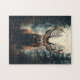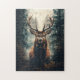 Eine mächtige und dramatische Szene eines Elchs, der stolz im Wald stehend ist, seine majestätischen Geweihten, die über dem dichten Wald ragen. Die tiefen Schatten und die mickrige Atmosphäre rund um den Elch schaffen ein Gefühl von Mysterium und Kraft und erfassen die raue Schönheit der Natur.