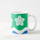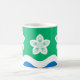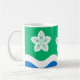 Mug avec design avec un drapeau du comté historique de Cumberland, en Angleterre, Grande-Bretagne; drapeau vert avec trois fleurs Parnassus et des vagues blanches et bleues