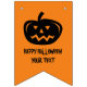 La coutume a découpé les drapeaux principaux de bannière d'étamine de partie de Halloween de citrouille. Visage orange et noir de citrouille découpant la conception avec le message de salutation personnalisé. Approvisionnements effrayants de partie et accessoires de do-it-yourself pour la nuit et le des bonbons ou un sort heureux de Halloween. Le décor d'amusement pour la maison, bureau, entreprise constituée en société, magasin, magasin, événement de surprise, anniversaire, mariage, baby shower, pendaison de crémaillère, anniversaire, célébrations, rassemblements, réunion, parties de costume qu'etc. ajoutent votre propre texte à ceci le font vous-même modèle. Modèle de typographie de hantise. Faites vos propres drapeaux sur une ficelle. Gentil pour des enfants et des adultes. Changez la quantité pour obtenir le prix discount en vrac bon marché.