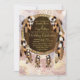 Ein Traum-Catcher-Design mit goldbraunen Zierleisten, die ein rundes Bambuskreisnetz mit braunen Federn und roten Perlen auf einem weichen Federhintergrund für eine Hochzeit beinhalten.