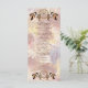 Ein Traum-Catcher-Design mit goldbraunen Zierleisten, die ein rundes Bambuskreisnetz mit braunen Federn und roten Perlen auf einem weichen Federhintergrund beinhalten, um Ihren großen Tag individuell zu gestalten.