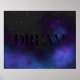 Poster mit dem Wort "Traum" in massiver schwarzer Hauptstadt Buchstaben Set gegen einen weichen schwarzen Sternenhimmel inmitten von blauen und lila Nebel Weltraum Wolken. Subtil, dunkel und tief wie das geheimnisvolle Reich der Träume. Verwenden Sie die Textvorlage, um einen Namen hinzuzufügen oder ein kurzes Zitat inspirieren. ♡ Idyllfire