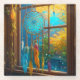 Hübscher boho-blauer und orangefarbener Träumer mit Federn und Perlen in einem Fenster mit hübscher Outdoorszene. Ai wird im Illustrationsstil verwendet.