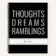 Benutzerdefiniertes Notebook mit einem großen überdimensionalen Titel von "Thoughts Dreams Ramblings" auf einem schwarz-weißen Titelblatt mit Ihrem Namen und Hintergrundfarbe, die auf Ihren Favoriten geändert werden können.