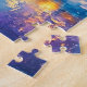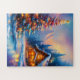 Ein traumhaftes, abstraktes Gemälde eines bunten Weihnachtsbaumes und einer skurrilen alten Hütte in schneebedeckten Bergen.