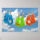 Farbenfrohe Flip-Flops, die an einer Wäscheleine hängen.