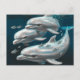 Eine lebendige Unterwasserszene mit drei verspielten Delphinen, die anmutig zusammen schwimmen. Ihre schlanken, silberblauen Körper glimmen unter der Wasseroberfläche, während sie springen und durch den Ozean gleiten, umgeben von einem Wirrwarr aus Blasen und Sonnenlicht, das von oben nach unten filtert. Die Delphine wirken fröhlich und voller Energie, ihre Bewegungen synchronisiert, während sie die Tiefen des Meeres erkunden.