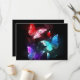 Drei helle, rote, lila, grüne, strukturierte Nachtschmetterlinge auf schwarz-leuchtendem Hintergrund.