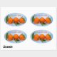 Schließen Sie Blick auf eine Linie von drei Mandarinen Zitrusfrüchten mit grünen Blätter, und Tropfen Wasser auf die Haut. Texturierter blauer Hintergrund. Kontrast zu den Farben Orange, Grün und Blau. Ovale Aufkleber. Sie können den Vorlagentext ändern oder löschen.