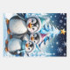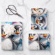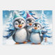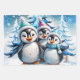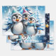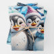Drei bezaubernde Pinguine stehen in festlichen Winterhüten und farbenfrohen Schals. Ihre großen, runden Augen strahlen vor Freude, während ihre flauschigen weißen Bäuche mit dem hellblauen Weihnachtsbaum kontrastieren, der mit funkelnden Lichtern geschmückt ist. Die Pinguine lächeln glücklich und scheinen bereit, den Zauber der Feriensaison zu feiern. Rund um sie tanzen zarte Schneeflocken durch die Luft, während funkelnde Sterne am Himmel leuchten und eine warme, festliche Atmosphäre schaffen. Dieses Design vereint den Geist der Weihnachten - voller Freude, Freundschaft und Winterwundern!