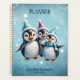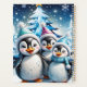 Drei bezaubernde Pinguine stehen in festlichen Winterhüten und farbenfrohen Schals. Ihre großen, runden Augen strahlen vor Freude, während ihre flauschigen weißen Bäuche mit dem hellblauen Weihnachtsbaum kontrastieren, der mit funkelnden Lichtern geschmückt ist. Die Pinguine lächeln glücklich und scheinen bereit, den Zauber der Feriensaison zu feiern. Rund um sie tanzen zarte Schneeflocken durch die Luft, während funkelnde Sterne am Himmel leuchten und eine warme, festliche Atmosphäre schaffen. Dieses Design vereint den Geist der Weihnachten - voller Freude, Freundschaft und Winterwundern!