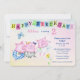 Dies ist eine niedliche Einladung für ein Kleinkind oder eine Geburtstagsparty für ein Baby. Es gibt drei schöne kleine Schweine, die einen Geburtstag jig tanzen. Ein blauer Schmetterling flattert um sie herum, und eine gelbe Blume wächst unten. Über den Bildern steht ein farbiges Banner mit dem Titel "Happy Birthday"! Ihr benutzerdefinierter Text ist in blau und rosa oben und rechts. Alles wird auf einem hübschen pastellfarbenen Hintergrund platziert. Die Rückseite der Einladung hat den gleichen Hintergrund, mit einem niedlichen Vogelbild, und ein zusätzliches Textfeld für Richtungen oder andere Informationen. Einfach anzupassen!
