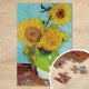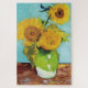 Drei Sonnenblumen (1888) von dem niederländischen Künstler Vincent Van Gogh. Die originelle Kunstmalerei ist ein Öl auf der Leinwand, das ein ruhiges Leben mit hellgelben Sonnenblumen vor türkisfarbenem Hintergrund darstellt.