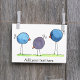 Fun Aquarellmalerei von drei whimsical Vögel in blau und lila mit langen, mageren Beinen stehend auf grünem Gras. Eine Vorlage unter dem Bild, um Ihren eigenen Text zu personalisieren.