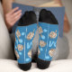 Fügen Sie diese optionalen Hanukkah Socken in Ihr Party Kleid für jedes Festival of Lights Event oder Geschenk ein Paar für alle in der Familie auf einer der Nächte des geben. Set auf einem Hintergrund von reichhaltigem mittlerem dunkelblau, ein verstreutes Muster von kleinen Imitaten Eichenholz-dreidels drehte sich in jeder Richtung entlang Ihres Monogramms, zuerst in Himmelblau und Punkte hier und da in demselben hellblauen Ton. Von der Lounge bis zum blinkenden Hanukkah-Flair im Büro oder einem Chanukah-Party, sind diese personalisierten Hanukkah-Socken eine niedliche Möglichkeit, den Urlaub zu feiern.