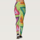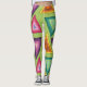 Diese Leggings haben ein Design aus den 1970er Jahren auf konzentrische Dreiecke in aquamarinen, orangen, gelben, lila und rosa Farbtönen auf einem grünen Feld.