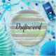 Driftwood ist in schwarzem Skript geschrieben. Coole Aquarellstreifen in tropftholz grau, grün, blau vor weißem Hintergrund. Fun geometrische Sommervibe. Original Artwork Design © TamiraZDesign.