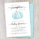 Ein niedlicher, fröhlicher und heller Babyantrieb mit Duscheinladung mit "A Sweet Little Pumpkin Is On Your Way", geschrieben in einer Mischung aus sanfter, moderner Typografie und stilvollem Schriftsatz, und einer pastellblauen Wasserfarbe eines Kürbis. Unterhalb ist "Baby-Dusche" in der gleichen stilvollen Schrift geschrieben und Sie können den Namen der Mutter und den Antrieb durch Duschdetails in minimaler moderner Typografie personalisieren.