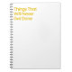 Un carnet en spirale gai avec un texte jaune en gras sur blanc, qui dit "Des choses qui ne se feront jamais". Idéal pour les procrastinateurs, les étudiants, ou toute personne qui aime bien rire en faisant des listes qu'ils ignoreront.