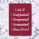 "Je l'ai fait ! J'ai... fini !" Drôle, humoristique, hilarant, amusant, rouge / bordeaux, personnalisable, invitation à la remise des diplômes. Invitation amusant pour les garçons et les filles diplômés de la maternelle, du collège ou de l'université. Grande carte de faire-part personnalisée pour les diplômés de tous âges.