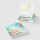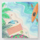 Der Blick aus der Drohne auf einen Paradies für einen perfekten Urlaub, tropisch, unter exotischer Vegetation, Bananenbäumen, Hibisken, Palmen und mit Schnorchelelementen auf dem Sand, einem Badetuch, frischer Kononut, einem Kajak am Ufer, Seestern und Fischen, die auf dem Ozean schwimmen. Vector Illustration Copyright BluedarkArt.