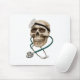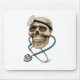 Medizinisches Stethoskop benutzt, um zu den Herzschlägen und zu einem Reflektor auf einem Schädel zu hören, zum von Doktorschädel darzustellen