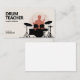 A business card for a drum teacher or a drummer. The illustration consists of a silhouette of a drum kit, a drummer with his hands highlighted, and a striped red-brown sun in the background.