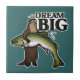 Mit dieser Illustration, die einen stehenden Flussotter enthält, der eine übergroße Regenbogenforelle hält, die größer ist als er, wird Hoffnung und Inspiration verbreitet, neben dem Text "Dream Big."Eine ideale Kachel für Optimisten, Träumer, Absolventen und sogar Wunschfischer!