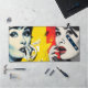 Two women are depicted in a vibrant, pop art style, one in shades of blue and yellow and the other in grayscale with bold red lipstick. The background features a mix of abstract patterns in red and yellow tones.