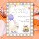 LUCKY DUCK. Party mit Aquarellfarben-Kindergeburtstag. Wasserfarbe niedliches Entlein im Geburtstagshut, Kuchen mit Beeren, lila Ballon, festliche Garage mit Fahnen. Beigefarbener Käfighintergrund.