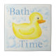Niedliches gelbes Gummiducky umgeben durch Badblasen, auf einer dekorativen Badezimmerfliese!