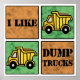 Vier Plätze mit einem Müllwagen-Cartoon und den Worten "Ich mag Dump Trucks!"